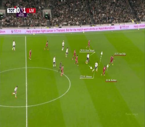 随后本坦库尔找到穆阿尼,后者转身摆脱科纳特并得以带球向前,约翰逊的跑动则带开了维吉尔-范戴克和米洛斯-凯尔凯兹,清出了一条通道。