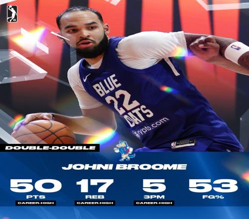 此役,76人次轮秀、蓝衫队内线乔奈·布鲁姆大放异彩,他本场34投18中,三分7中5、罚球7中5,狂轰50分17篮板5助攻1抢断2盖帽,得分等多项数据创生涯新高。
