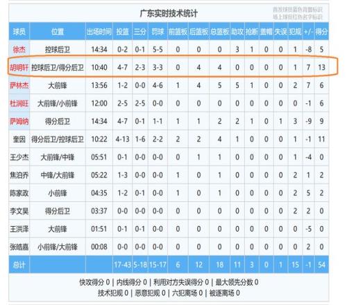 值得庆幸的是,广东队与北控队的比赛,胡明轩的状态回来了!在上半场比赛,胡明轩成为了广东队主要进攻点,只见胡明轩一次又一次冲到篮下得分,同时, 也是频频投进三分球,半场结束,胡明轩投篮7中4,其中,三分球3投2中,罚球3中3,砍下了13分4篮板的数据。投篮命中率,三分球命中率,都超过了五成,这对于胡明轩来讲,可以说是千年等一回了!真的是不容易呀。