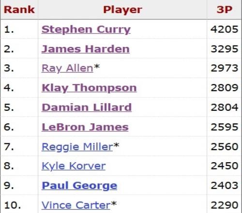 克莱目前距雷·阿伦还差158记三分
