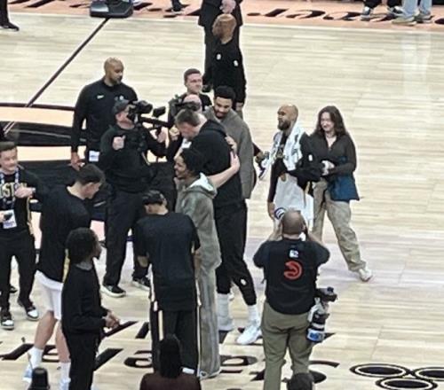 比赛结束后,绿军冠军成员、现老鹰中锋波尔津吉斯(本场因伤没有出战)拥抱了豪泽(本场命中10记三分),并与塔图姆、怀特寒暄。