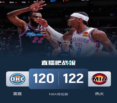 开场后雷霆轮番冲击内线抢得先机,杰伦威外线手感火热连中两记三分,阿德巴约和鲍威尔也连续用三分回应,亚历山大状态火热带领雷霆占据场面主动。第二节上来雷霆手感依旧火热,外线连中三分打停热火。热火暂停调整后加德纳连中三记三分将比分追上,杰伦威受伤离场,亚历山大重新登场为雷霆稳住局面,半场过后雷霆领先5分。易边再战,两队打得十分激烈,热火逐渐外线找到手感,他们连续命中三分将比分反超,依旧是亚历山大挺身而出为雷霆止血。此后两队打得十分胶着,四节也是多次打成平手,比赛最后阶段亚历山大接连单打拿分,阿德巴约毫不示弱也连续回应,维金斯三分帮助热火再度反超,霍姆格伦空接没扣进,卡鲁索压哨三分绝杀不中,最终热火122-120终结雷霆5连胜。
