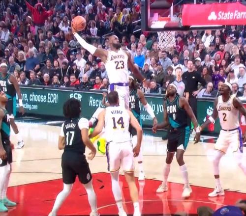 投篮威胁这么大詹姆斯三分线外晃飞两人大步踏进内线肆虐篮筐