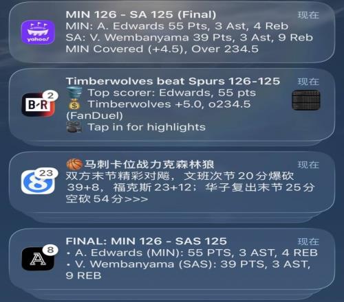 本场比赛最后时刻双方精彩对飚,剧情跌宕起伏,犬牙交错的比分也让美媒昏了头,包括TA、雅虎和露天看台在内的多家美媒的都出现了巨大失误,将比赛结果错写成了森林狼126-125击败马刺。