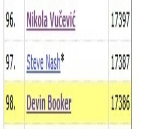 布克开场得到2分,他的生涯总得分来到17388分,超越队史名宿史蒂夫·纳什,上升至NBA历史第97位,他再得10分将超越武切维奇。