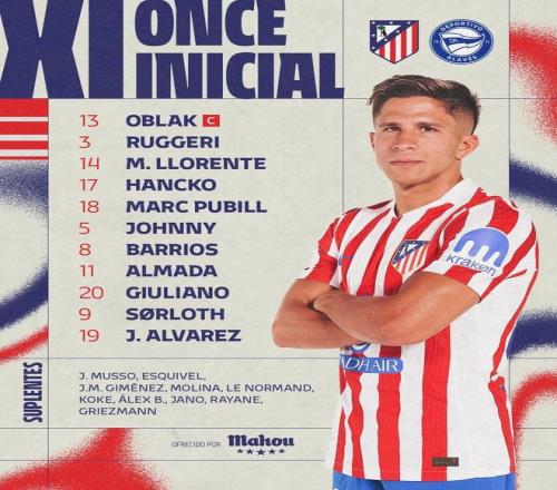 马竞vs阿拉维斯:胡利安阿尔瓦雷斯、奥布拉克首发,阿莱尼亚、洪尼奥托出战