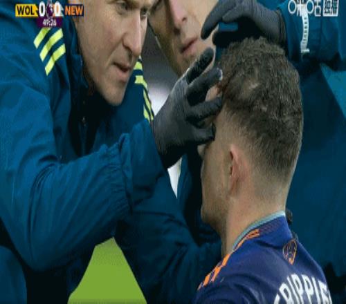 第50分钟,马内踢到特里皮尔面部,后者面部挂彩
