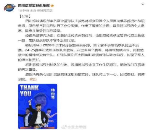 四川锦城俱乐部丰谷酒业篮球队主教练韩硕指导因个人原因向俱乐部提出辞职申请,俱乐部与韩指导进行充分沟通,作出了艰难的抉择,尊重韩指导的个人意愿,同意并接受韩指导辞呈。