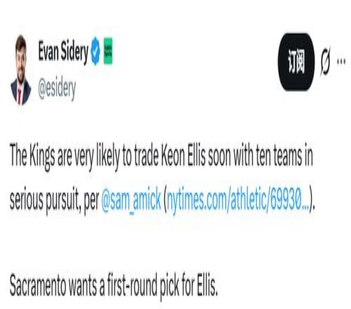 湖人面临激烈竞争!至少10队追埃利斯国王要价1个首轮末段选秀签
