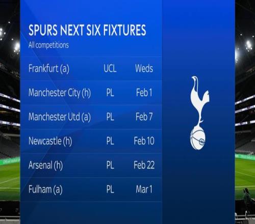 让球迷们愈发担忧的还有热刺2月的魔鬼赛程,他们接下来四轮的对手实力,属于英超所有球队中的最强梯队。