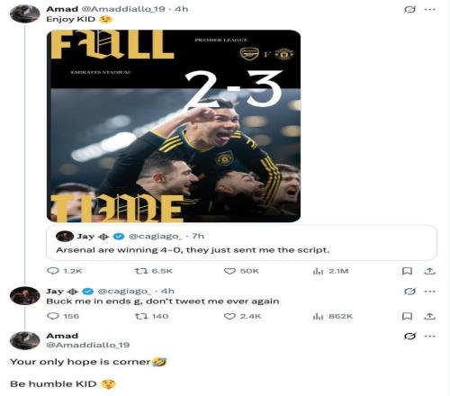 曼联在英超客场3-2击败阿森纳,取得联赛两连胜。赛后,曼联球员阿马德在社交媒体上回击赛前唱衰球队的阿森纳球迷。