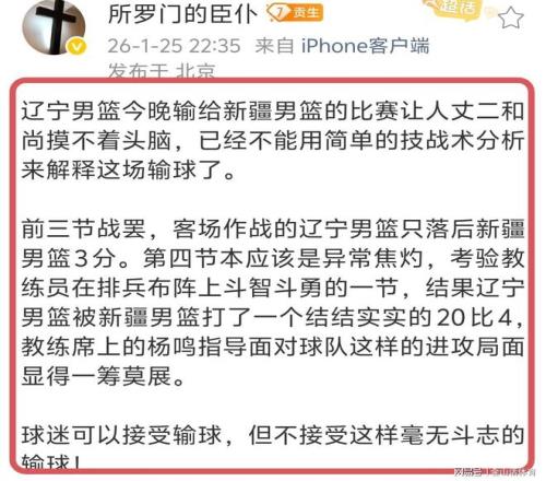 媒体人孔德昕社媒发文点评“辽宁男篮今天末节仅得4分...全场59比78不敌新疆。这场辽宁百回合82分,近三个赛季进攻最烂一战,上一次更差是2023年4月3日69比87不敌龙狮,当时百回合78.9分。”。