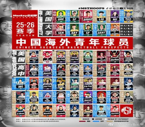 中国足球的留洋样本少,通过事实去对比“留在中超”和“海外留洋”的区别很难,但同处低谷的中国篮球已经为中国篮球打好了样。根据博主“Monkey会尬聊”的统计,25-26赛季共有53名中国籍球员效力于美国高中联赛和大学联赛(仅统计有职业前景的球员),其中多名球员获得星级评定。