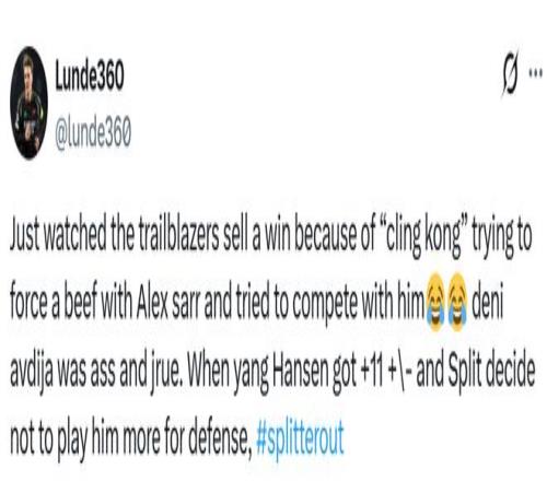 球迷lunde360写道:“刚看完比赛,开拓者简直是把胜利‘送’出去了!克林根和萨尔较劲,还想硬拼。阿夫迪亚和霍勒迪打得像坨屎。杨瀚森正负值都+11了,斯普利特(主教练)却以防守为理由不让他多打,#斯普利特下课。”