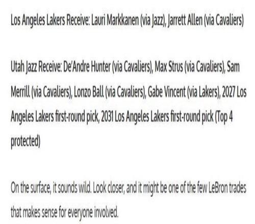 在潜在的交易方案中:· 克利夫兰骑士得到:勒布朗·詹姆斯、布朗尼·詹姆斯、蒂耶罗·琼斯; 洛杉矶湖人得到:劳里·马尔卡宁、贾勒特·阿伦;犹他爵士得到:亨特、斯特鲁斯、梅里尔、朗佐·鲍尔、文森特、湖人2027年无保护首轮签、湖人2031年前四顺位保护首轮签。这是一场各取所需的方案。骑士保住了多诺万·米切尔、达柳斯·加兰和埃文·莫布利的核心框架,却迎来了终极升级;湖人送走了不确定的未来,换回了正值巅峰的双星组合;爵士则从“不上不下”的尴尬中抽身,手握未来选秀权与到期合同,彻底拥抱重建。