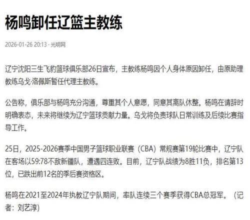 1月26日,辽宁队在结束对战新疆队的比赛后,杨鸣宣布了辞去辽宁队主帅一职。