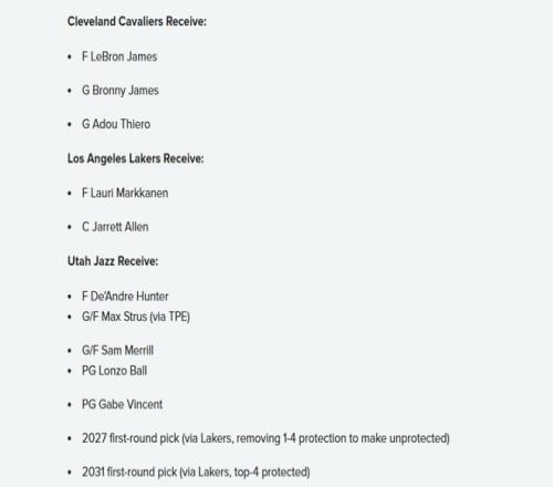 爵士得到:亨特+斯特鲁斯+梅里尔+鲍尔+文森特+2027年湖人首轮(取消前四保护,成为无保护首轮)+2031年湖人前四保护首轮。