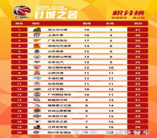 CBA常规赛第22轮全部战罢,广东、上海以及深圳等队先后出战。上海队这一轮比赛在主场以34分的巨大优势狂胜同曦队,成功将战绩提升到18胜4负,继续稳居积分榜第2。而11冠王广东队这一轮则爆冷输给了宁波队,继续排在积分榜第三名。深圳队这一轮大胜江苏队以后,他们则重新杀回积分榜第四名。而随着宁波、北控相继赢球,辽宁队又一次下滑到积分榜第12名。
